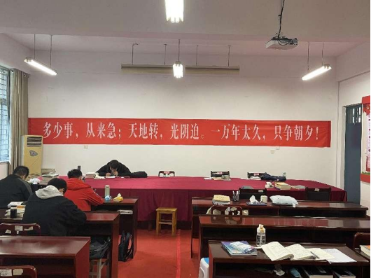 为缓解考研员工“找座难”的问题,我院克服种种困难,把唯一的党员活动室改成考研自习室,可容纳约80名同学自习,并在自习室悬挂了条幅、购买了桌布和热水器,让考研员工感到舒适、贴心。