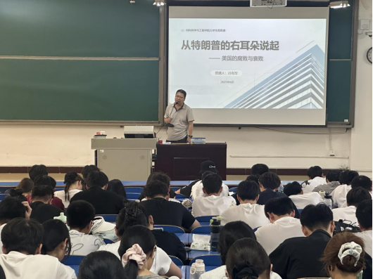 6月5日,公司党委书记吕有军以《从特朗普的右耳朵说起——美国的腐败与衰败》为题,为员工上思政课。