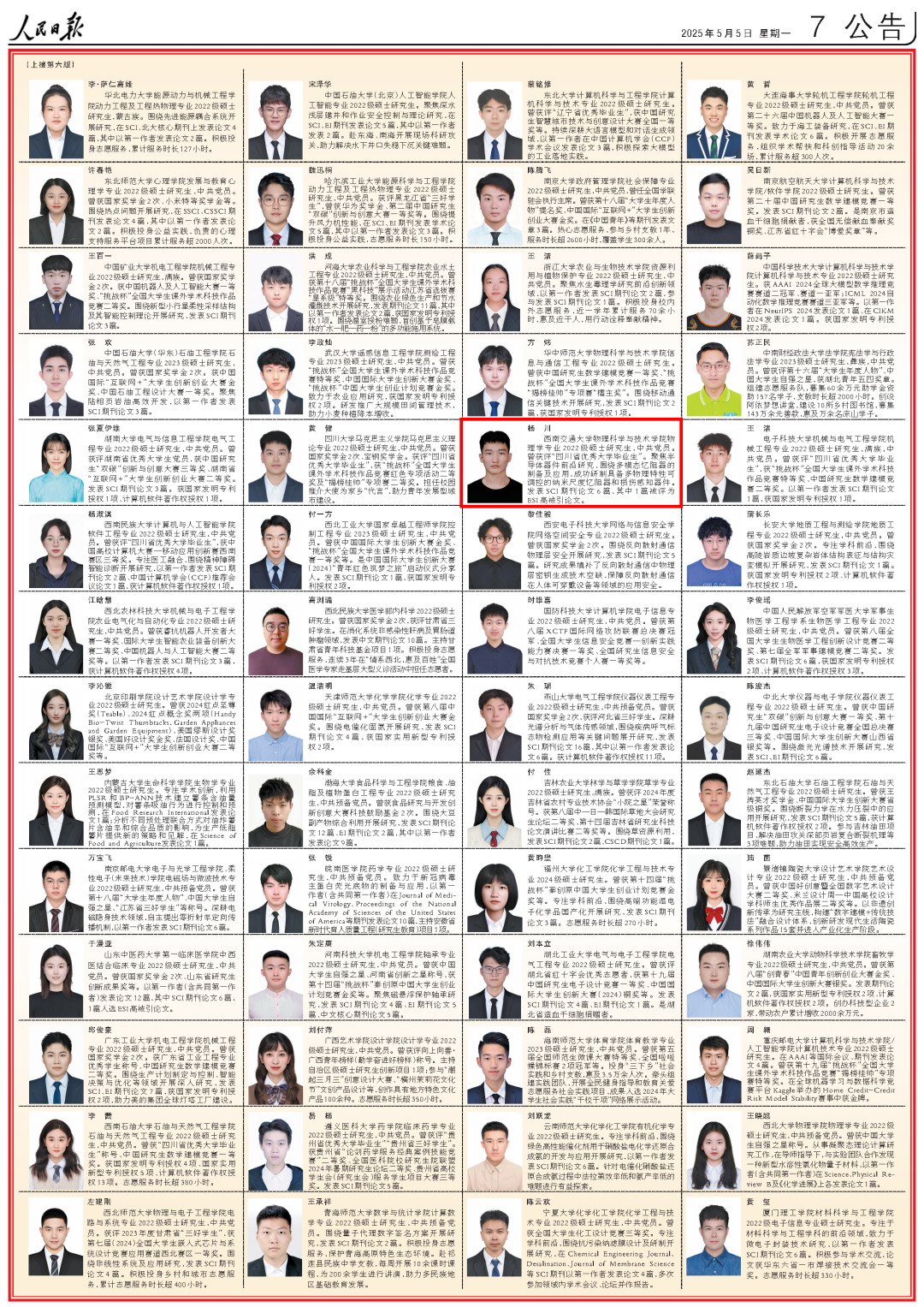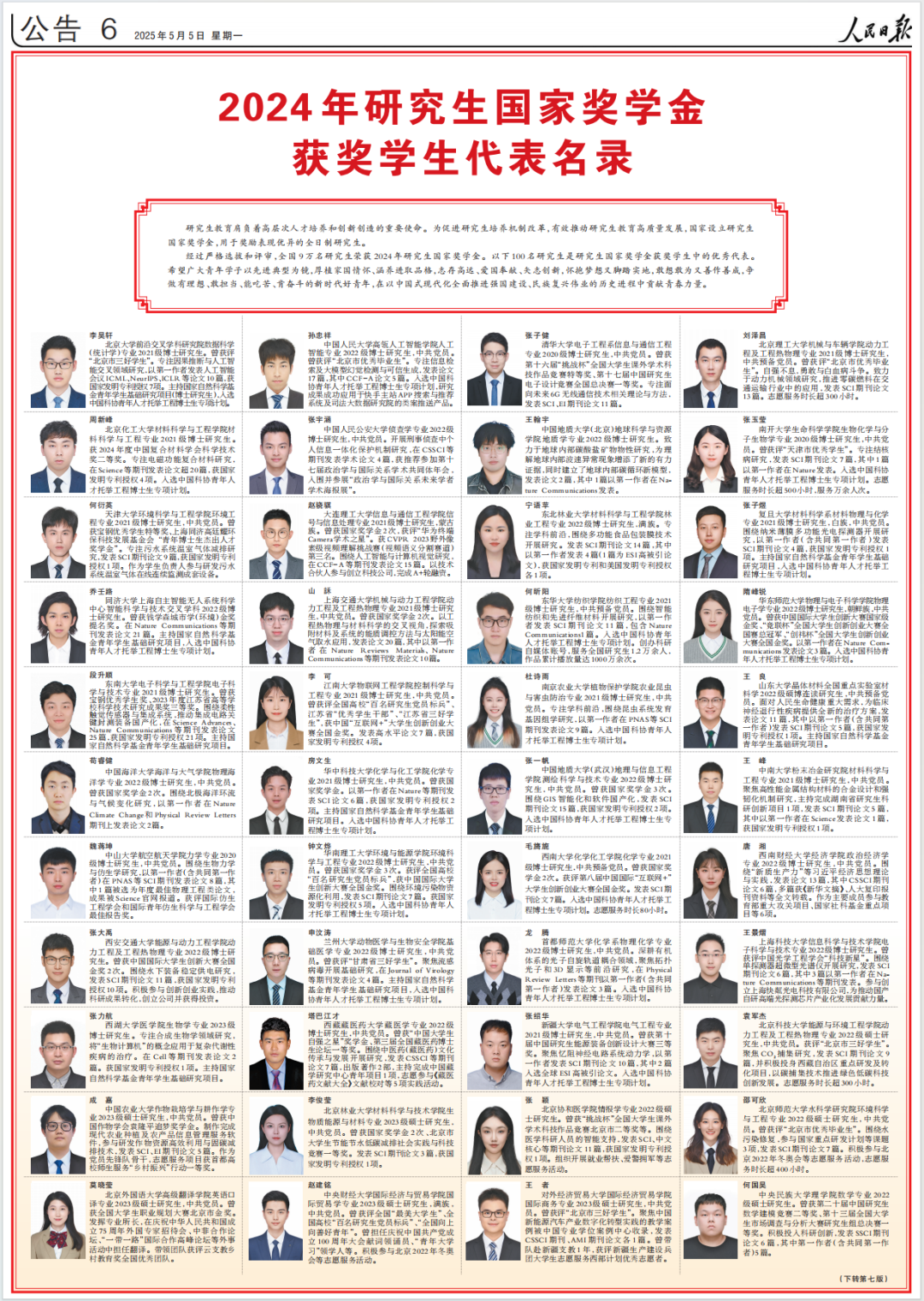 2025年5月4日至5日,《人民日报》连续刊载了《2024年研究生国家奖学金获奖员工代表名录》,杨川从9万名研究生获奖员工中脱颖而出荣耀登榜。