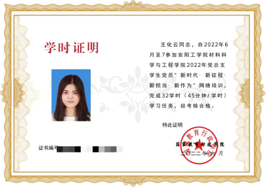 员工党员王化云同志结业学时证明