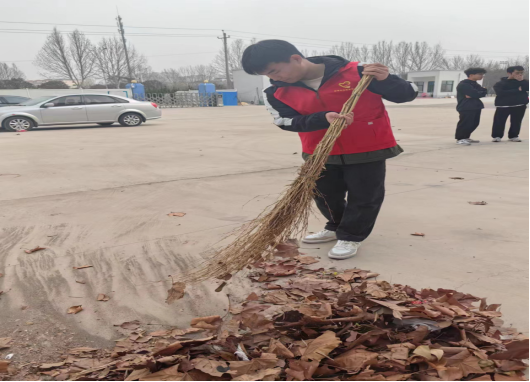 预备党员安佳豪在清理敬老院内落叶