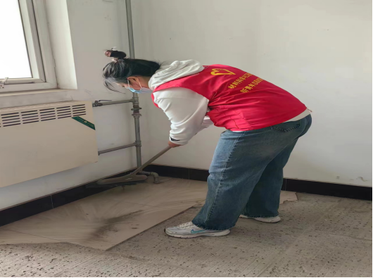 党员韩雪在打扫楼层卫生