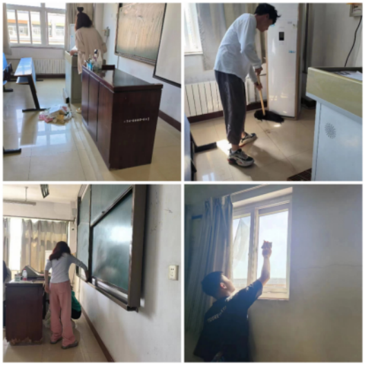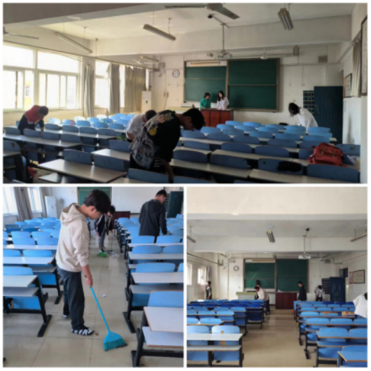 活动中,同学们积极且细致的打扫了A14教学楼6楼603、606、607、609四个教室。劳动过程中,同学们热情饱满、踏实认真,对教学楼进行“区域化”整理打扫。对教学楼内的墙壁、地面、桌椅、窗户、暖气片、空调及卫生死角进行“精细化”打扫,打扫结束后同学们和院旗一起合影留念。