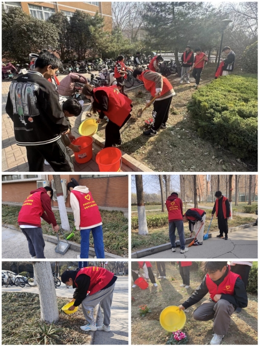 活动中,老师和同学们身穿志愿者马甲,带着清扫工具,分工合作地对教学楼旁洪河边的道路和绿化带进行了清理。大家团结一心,细致地清理绿化带里的杂物并提桶为树木浇水,他们的辛勤劳动成为了校园里一道动人的风景。