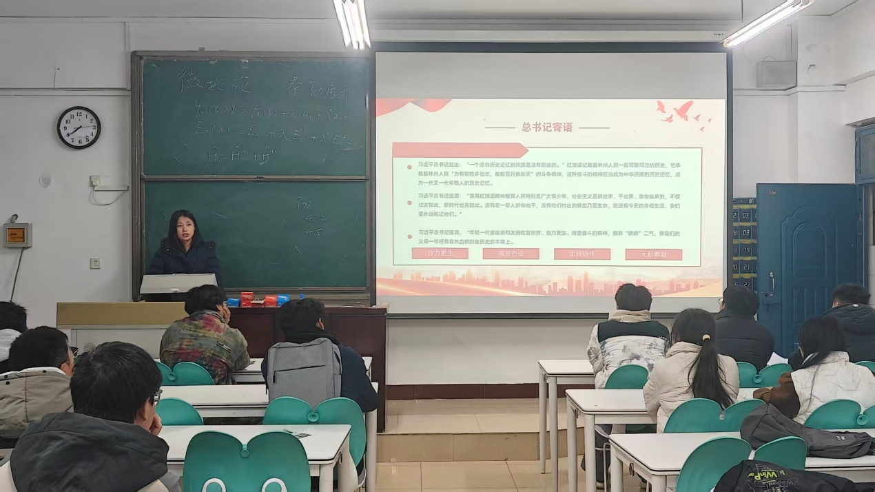 本次宣讲以凝聚青年力量为核心,围绕《红旗渠精神》展开。赵思宇同学介绍了红旗渠的修建原因、过程以及重要意义,通过展现林县人民生活的今昔对比,诠释了“自力更生、艰苦创业、团结协作、无私奉献”的红旗渠精神。阮枫月同学介绍了中国人民作为反法西斯东方主战场的顽强斗争,奋力抵抗的民族历史,硝烟虽已散去,历史警钟必须长鸣,当代人应肩负起捍卫和平的使命,让和平薪火永续相传。红旗渠精神犹如一面永恒的旗帜,激励着一代又一代人接续奋斗。