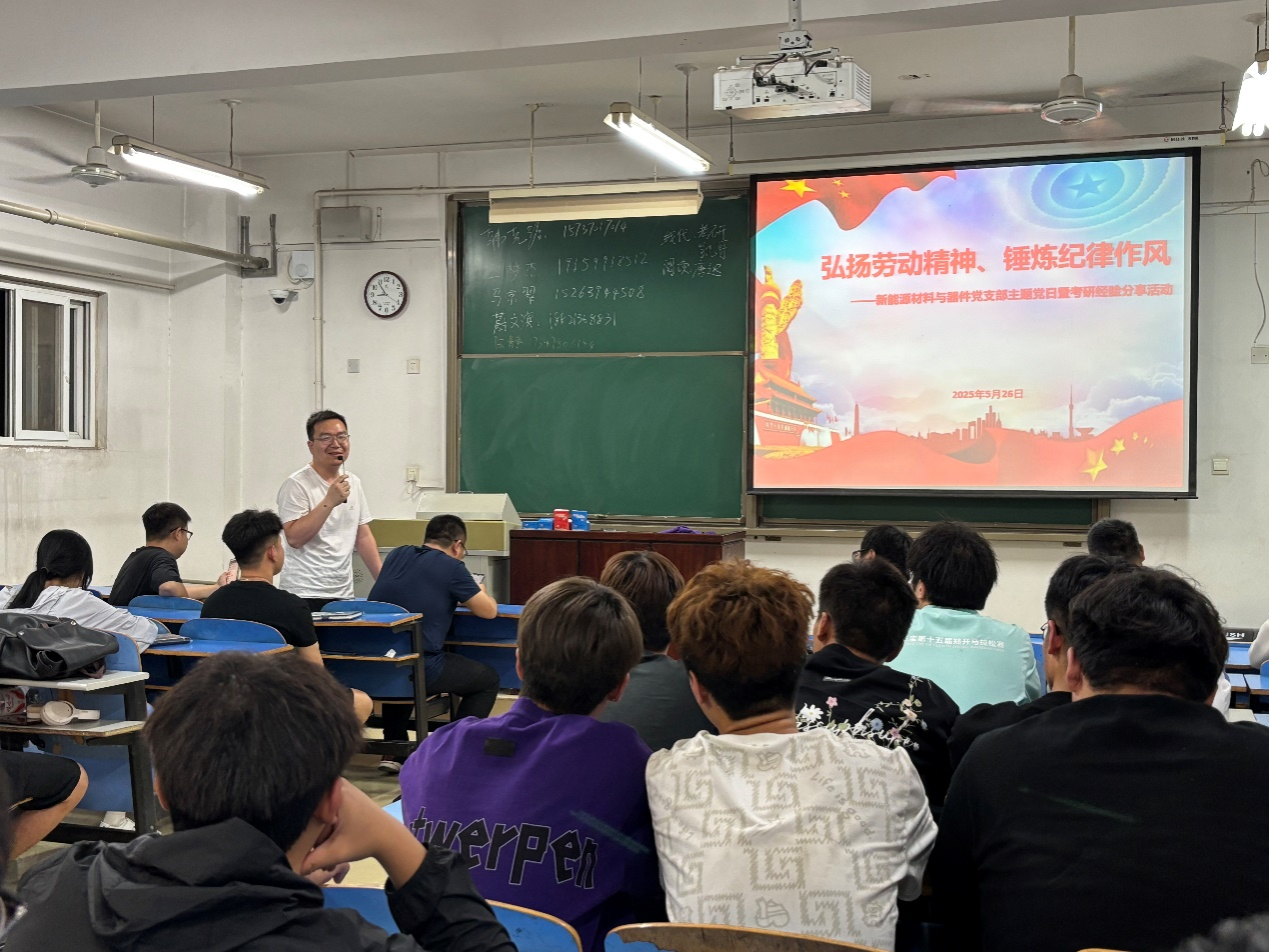 为深入学习贯彻中央八项规定精神,进一步加强党支部纪律建设和作风建设,5月26日,新能源材料与器件党支部在A14-607教室组织开展“弘扬劳动精神、锤炼纪律作风”考研经验分享主题党日活动。活动由党支部书记裴凤娟主持。