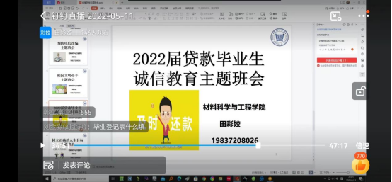 为帮助贷款毕业生树立遵纪守法和诚信理念,养成遵纪守法、诚实守信的良好习惯。5月11日,我院通过钉钉在线的形式召开了2022届贷款毕业生诚信还款教育会议。辅导员田彩姣及2022届全体贷款毕业生参加了会议。