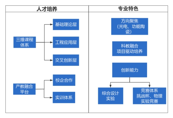 特色课程设置:围绕新型光电材料和功能陶瓷的开发与应用,设置特色课程模块,如《光伏物理与太阳能电池技术》《薄膜材料与技术》《锂电材料与锂电池》《光电测试技术》《计算材料学基础》等,形成鲜明的专业方向。
